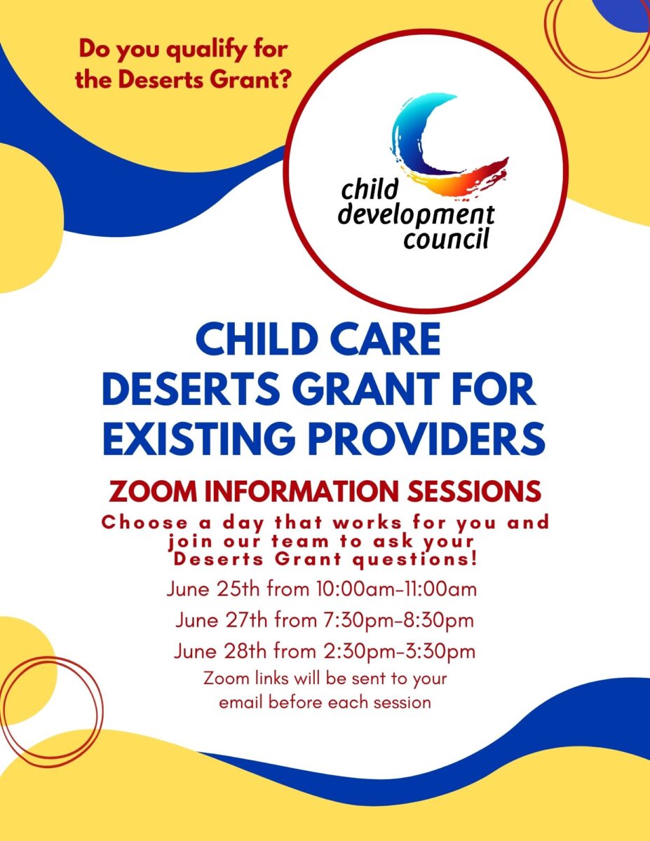 If you are an existing-licensed child care provider and have questions about your possible eligibility, please contact us at the Child Development Council and ask to talk to someone from our Desert Grant team. Please email Lisa Potter at lisa@childdevelopmentcouncil.org to get the Zoom Link.